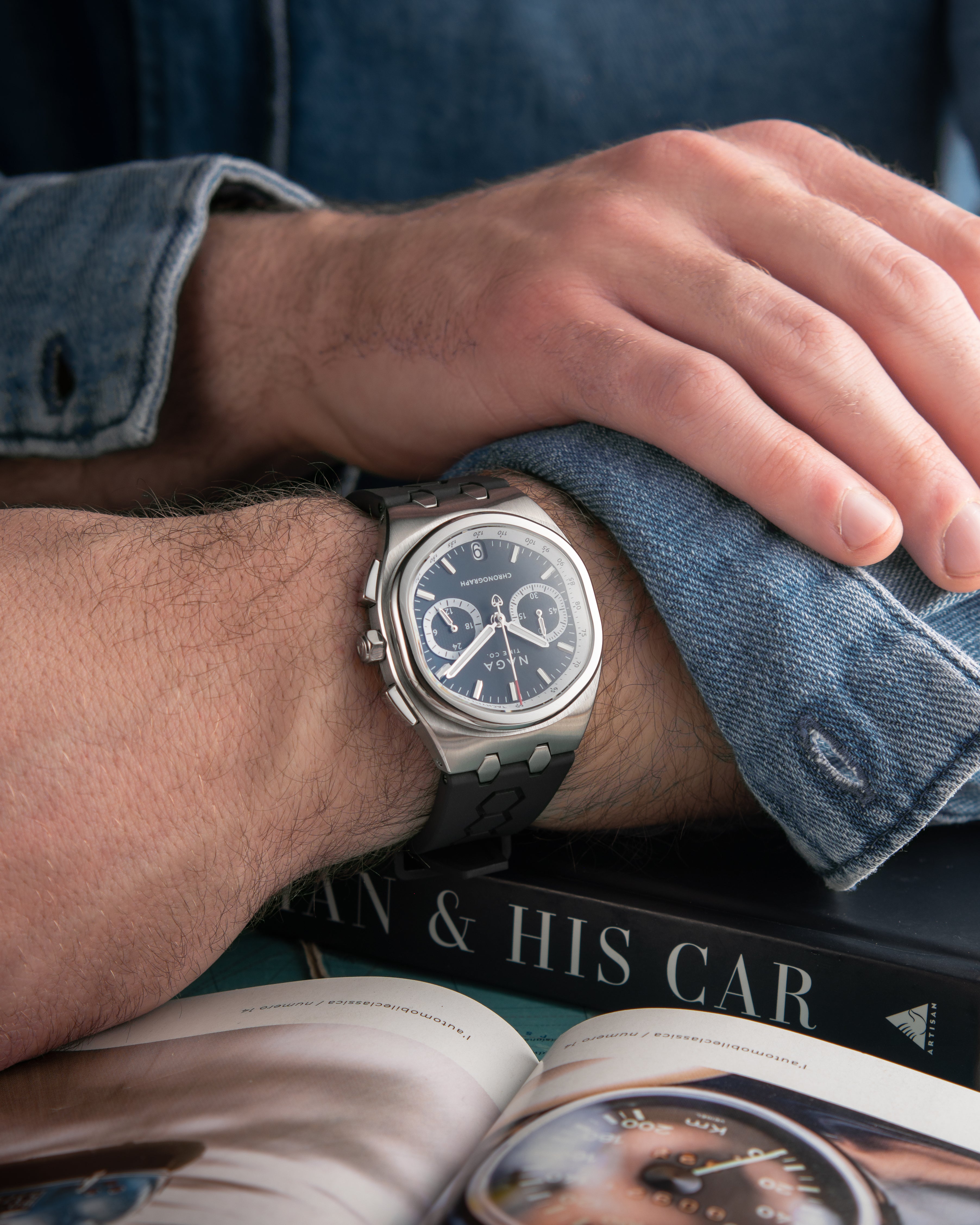 The watch remains exceptionally comfortable both on the NAGA bracelet, which offers a more refined and structured feel, and on the FKM Esaflex rubber strap, lightweight and highly durable, ideal for more active use.