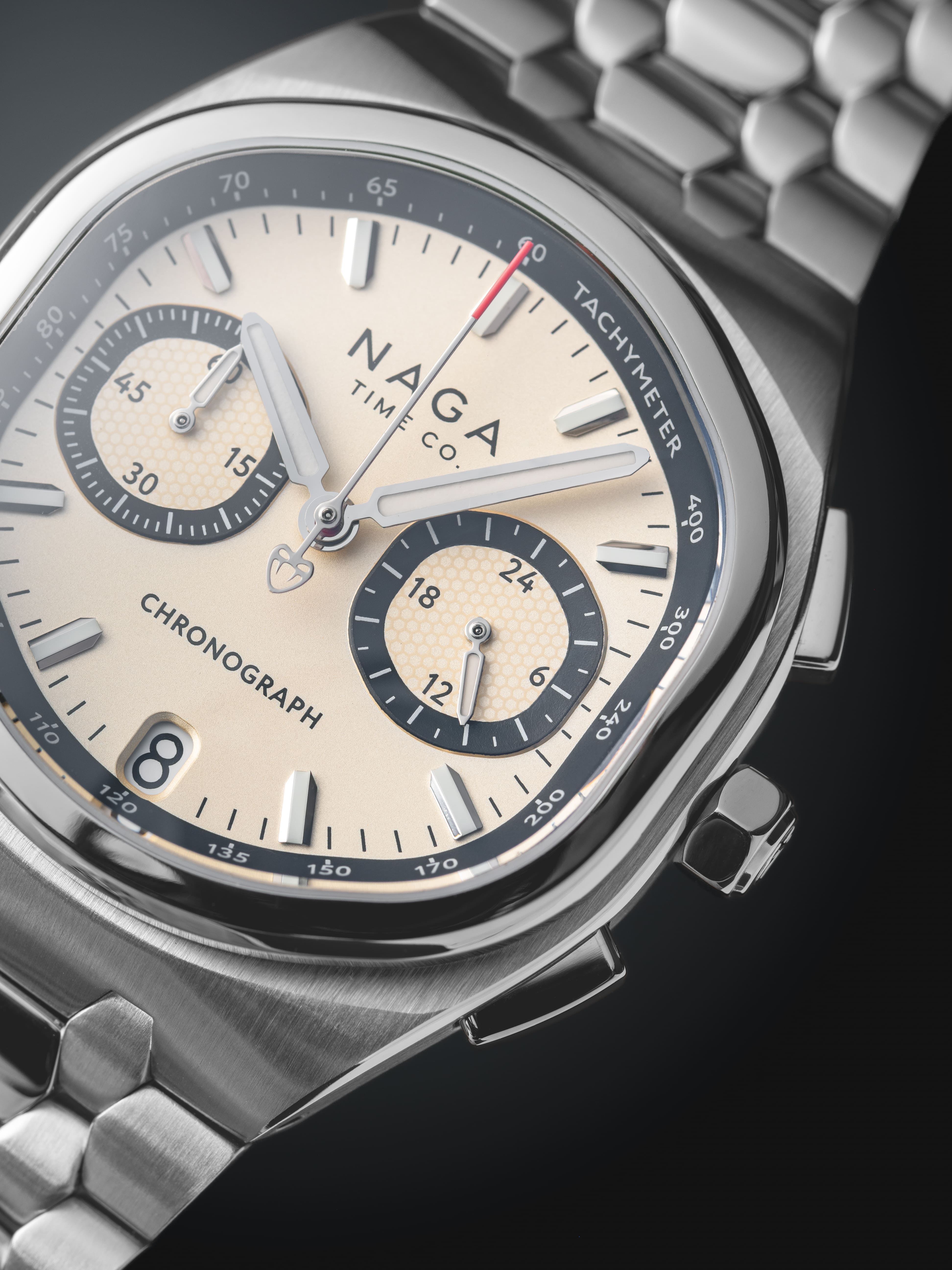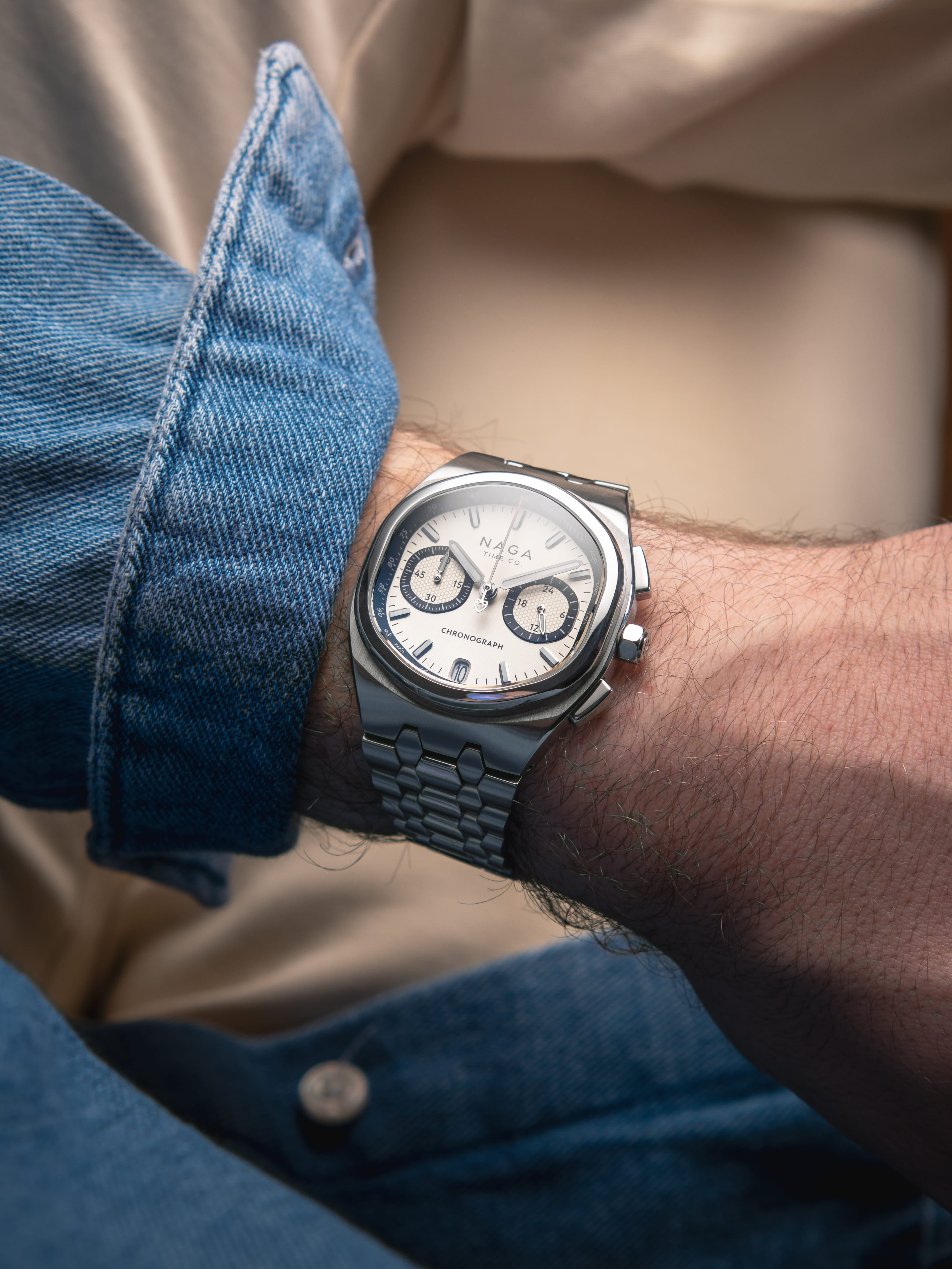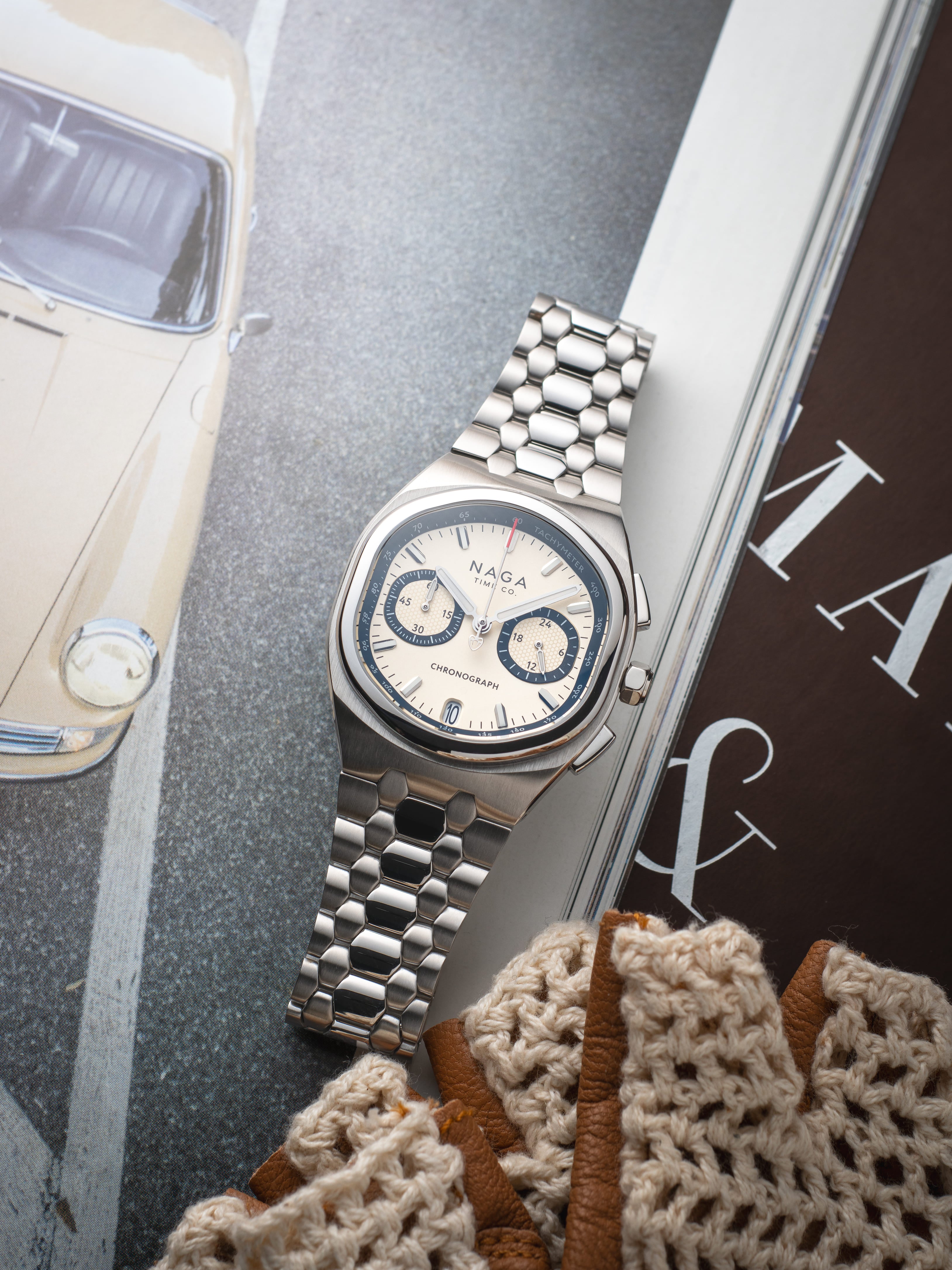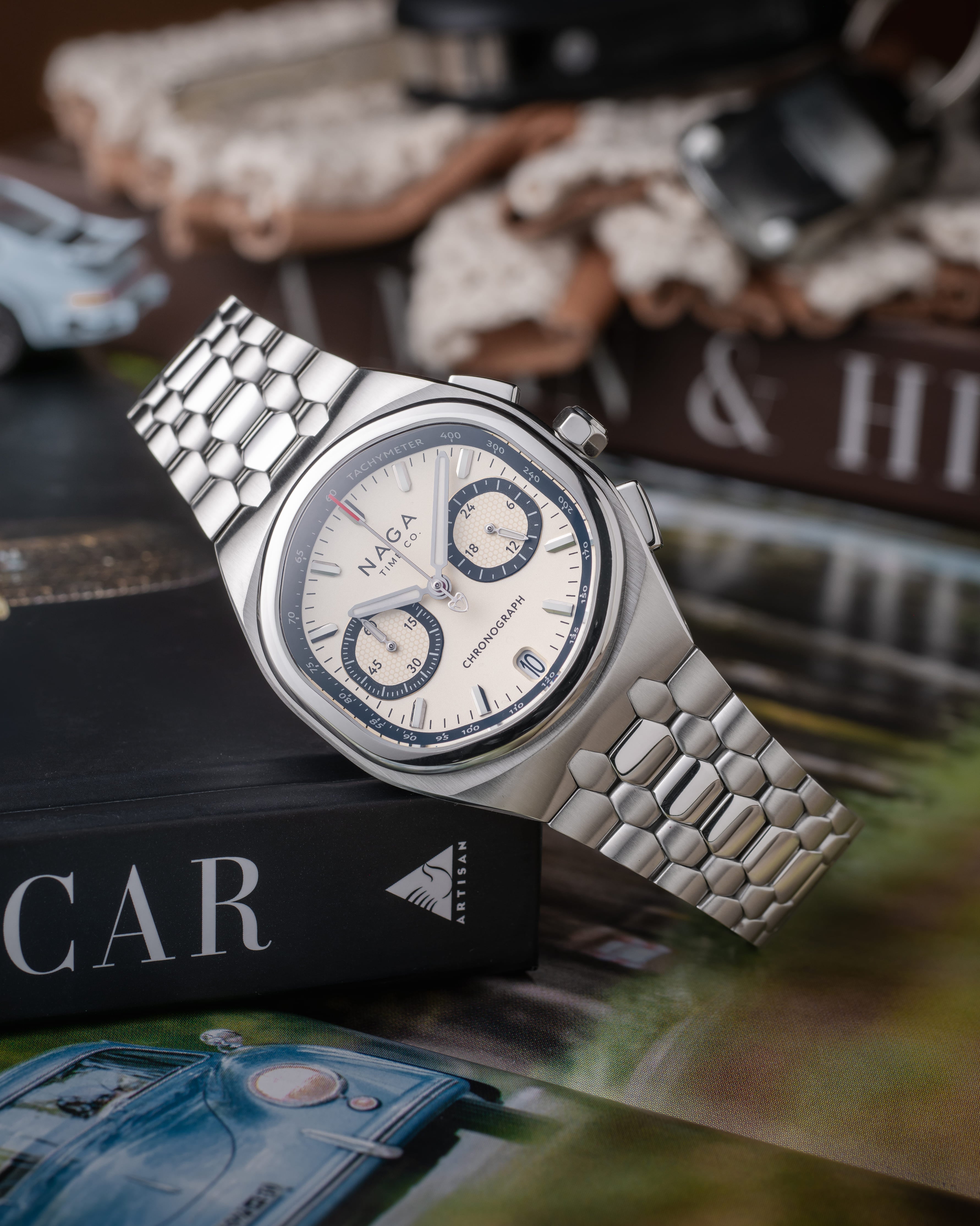 Unlike standard quartz movements, it features a mechanical chronograph module that delivers crisp pusher feedback and an instant snap-back reset, just like professional racing chronographs. The central chronograph hand sweeps smoothly across the dial, enhancing both legibility and visual refinement.