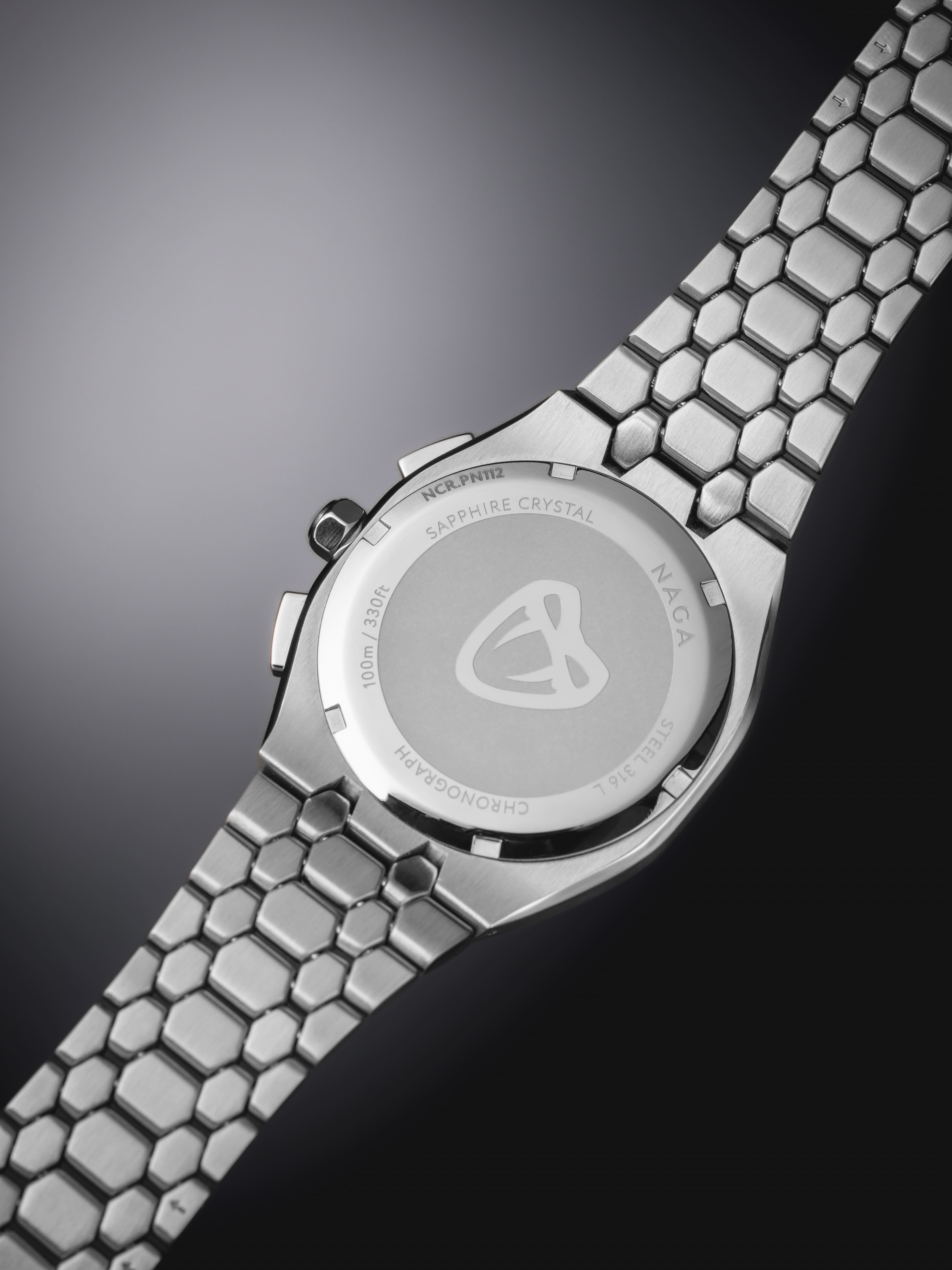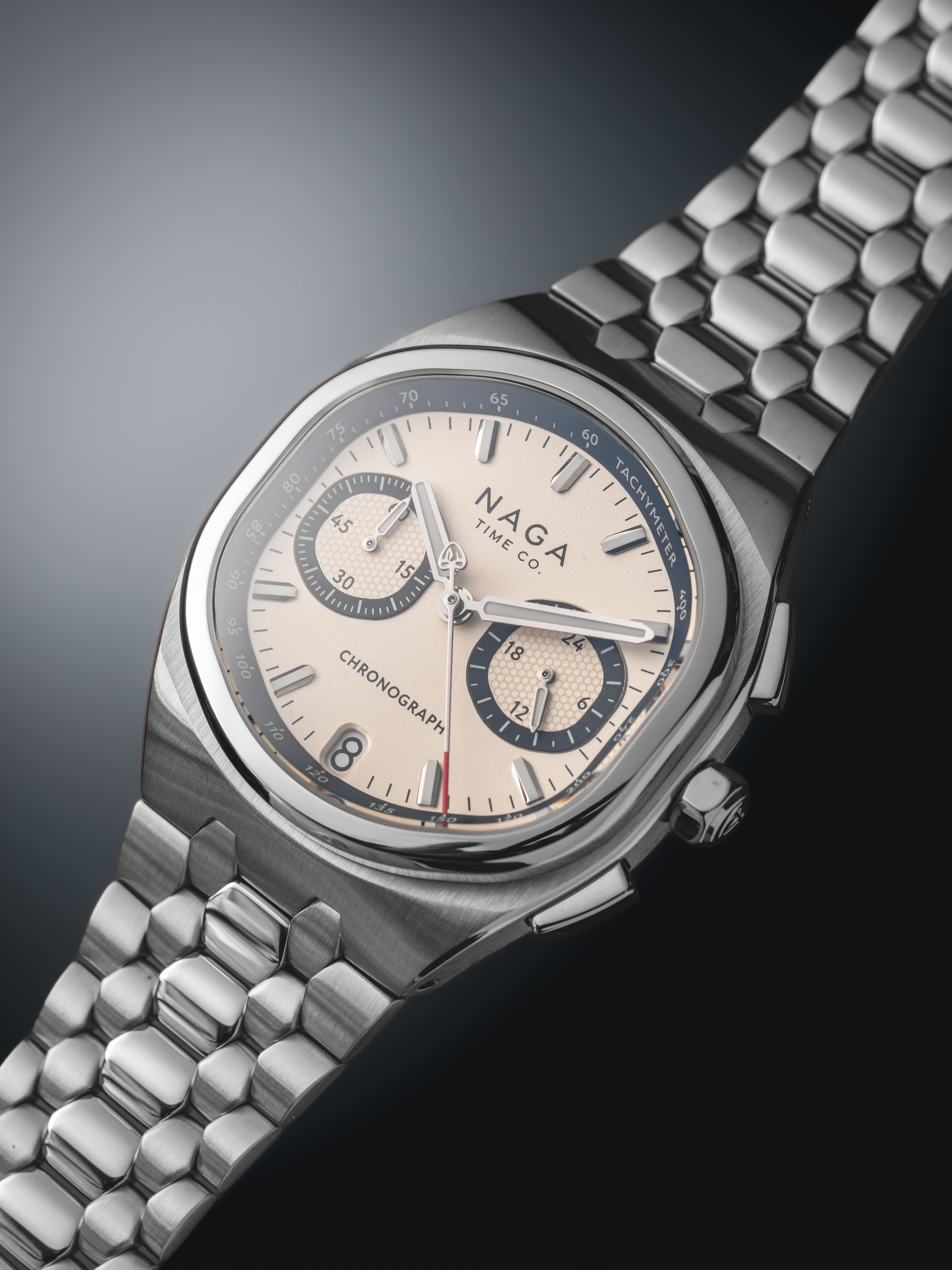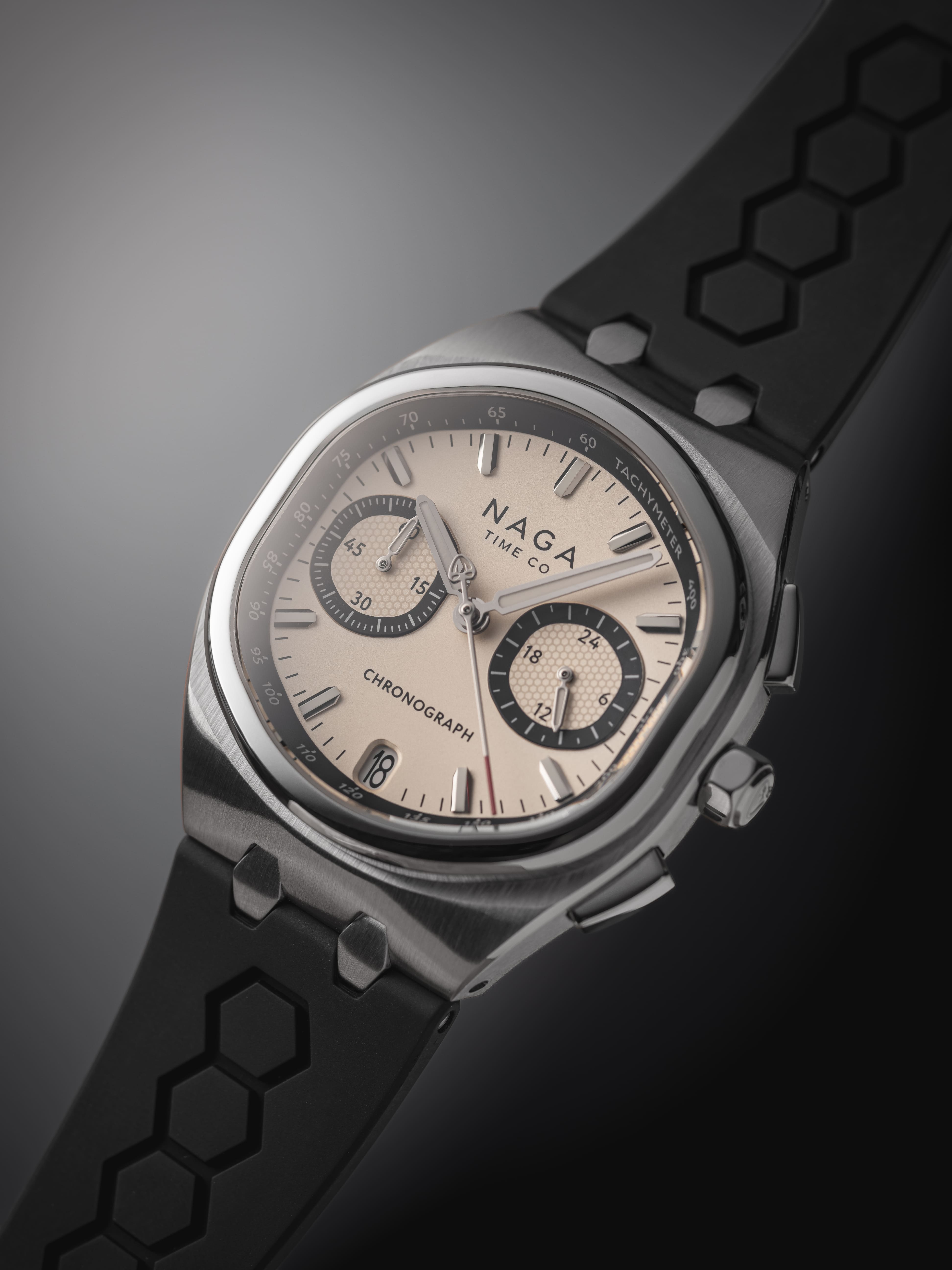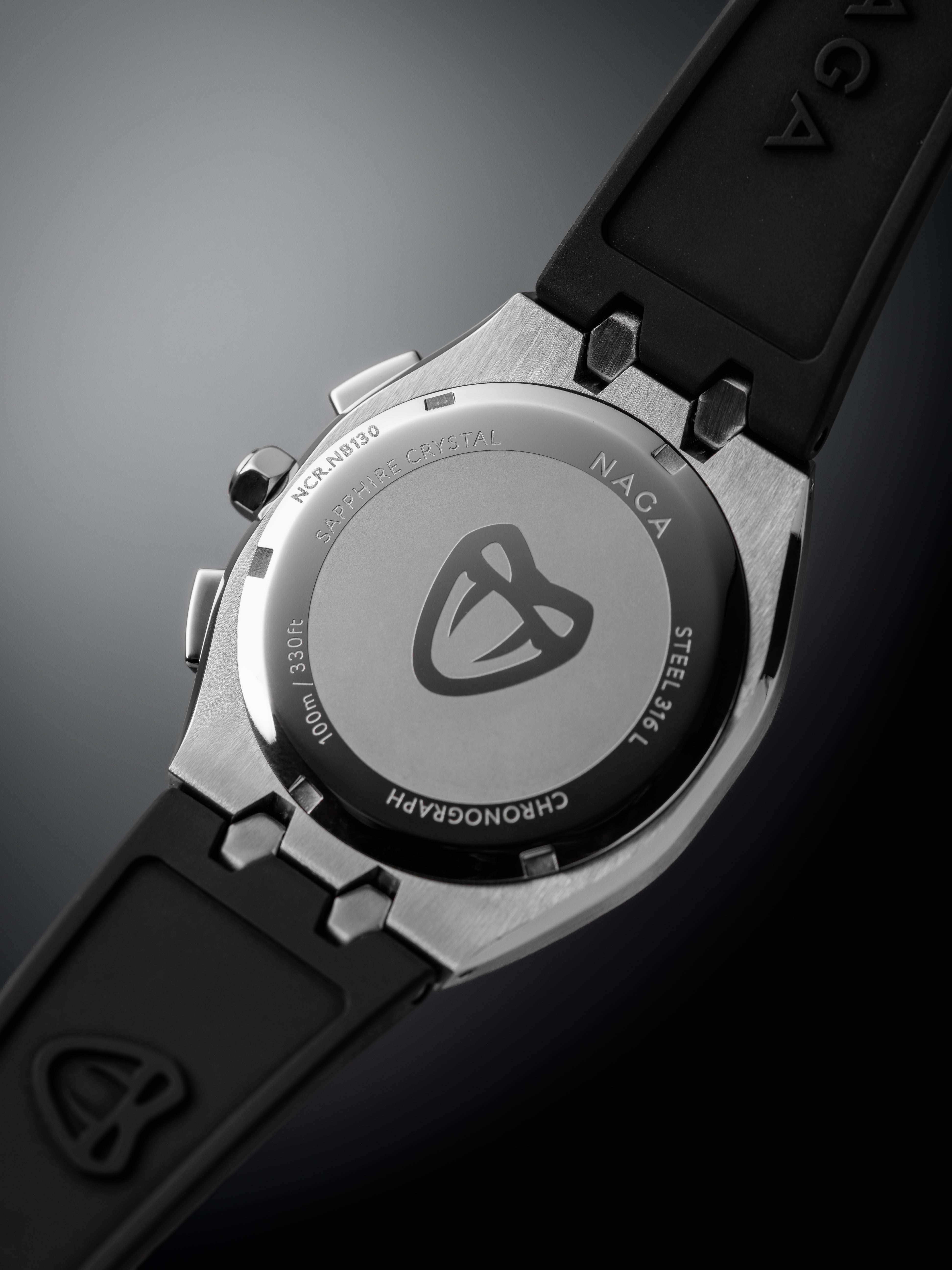 Unlike standard quartz movements, it features a mechanical chronograph module that delivers crisp pusher feedback and an instant snap-back reset, just like professional racing chronographs. The central chronograph hand sweeps smoothly across the dial, enhancing both legibility and visual refinement.
