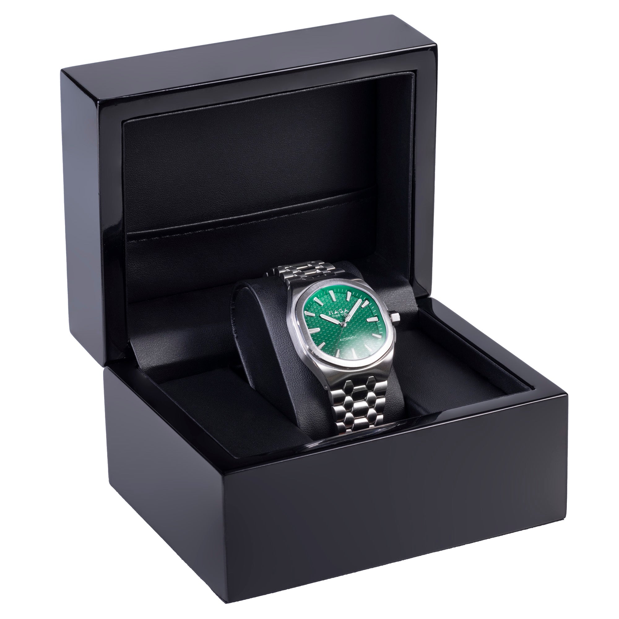 The bezel and case profile feature a polished angle contrasted with the satin finish, giving our watches a brilliant shine.
